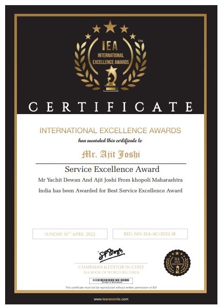 Service Excellence Award 06/05/2022 / By iea / Leave a Comment Service Excellence Award Record Holder Name: Mr Yachit Devan and Ajit Joshi Mr Yachit Dewan And Ajit Joshi From khopoli Maharashtra India has been Awarded for Best Service Excellence Award You can also become Awardee / Recordee of IEA BOOK OF WORLD RECORDSJUST REGISTER NOW! Be the AWARDEE Don’t keep this to yourself...!! Spread it to world.