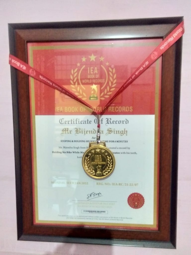 Mr Bijendra Singh from Haryana India had created a record by Holding Six Bikes while moving at a time for 6min with his teeth, both hands, both legs and back.