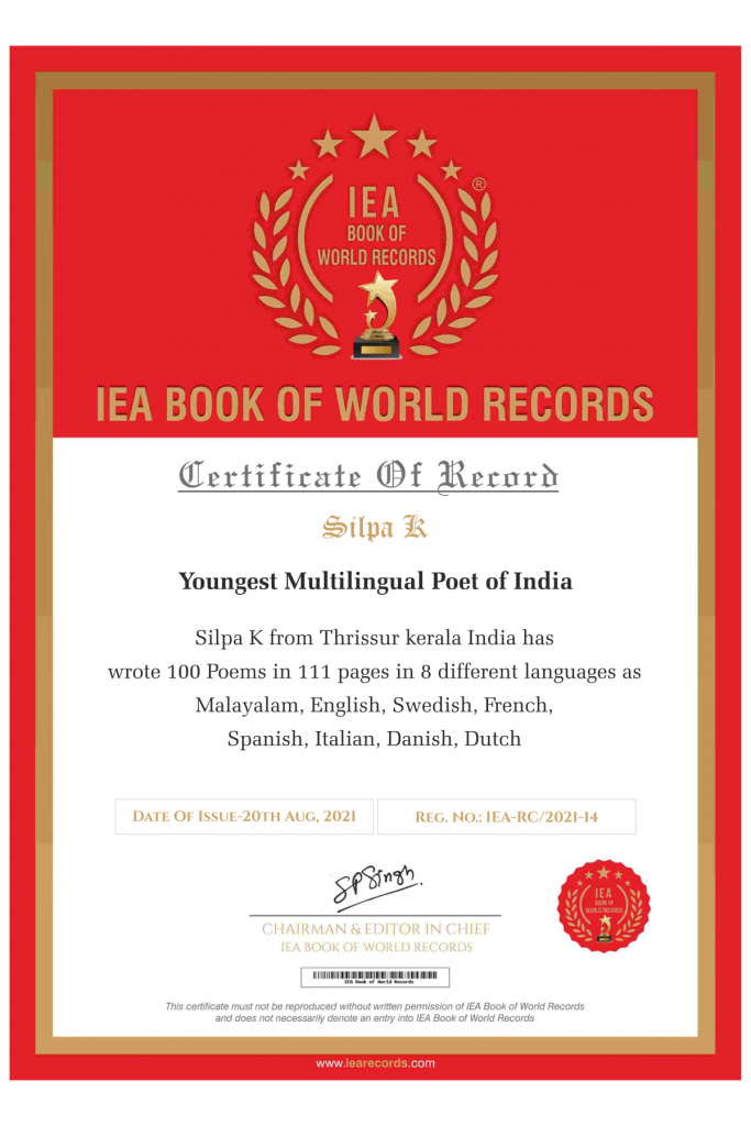 Silpa K from Thrissur kerala India has wrote 100 Poems in 111 pages in 8 different languages as Malayalam, English, Swedish, French, Spanish, Italian, Danish, Dutch
